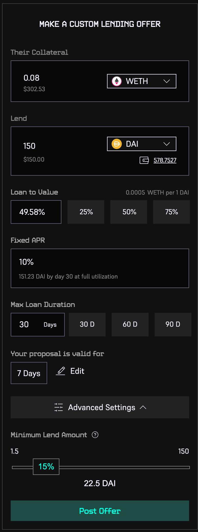 You don't have to wait for a borrowing offer to be posted; you can proactively post loan offers on the collateral of your choice, and as always with PWN, on your very own terms.