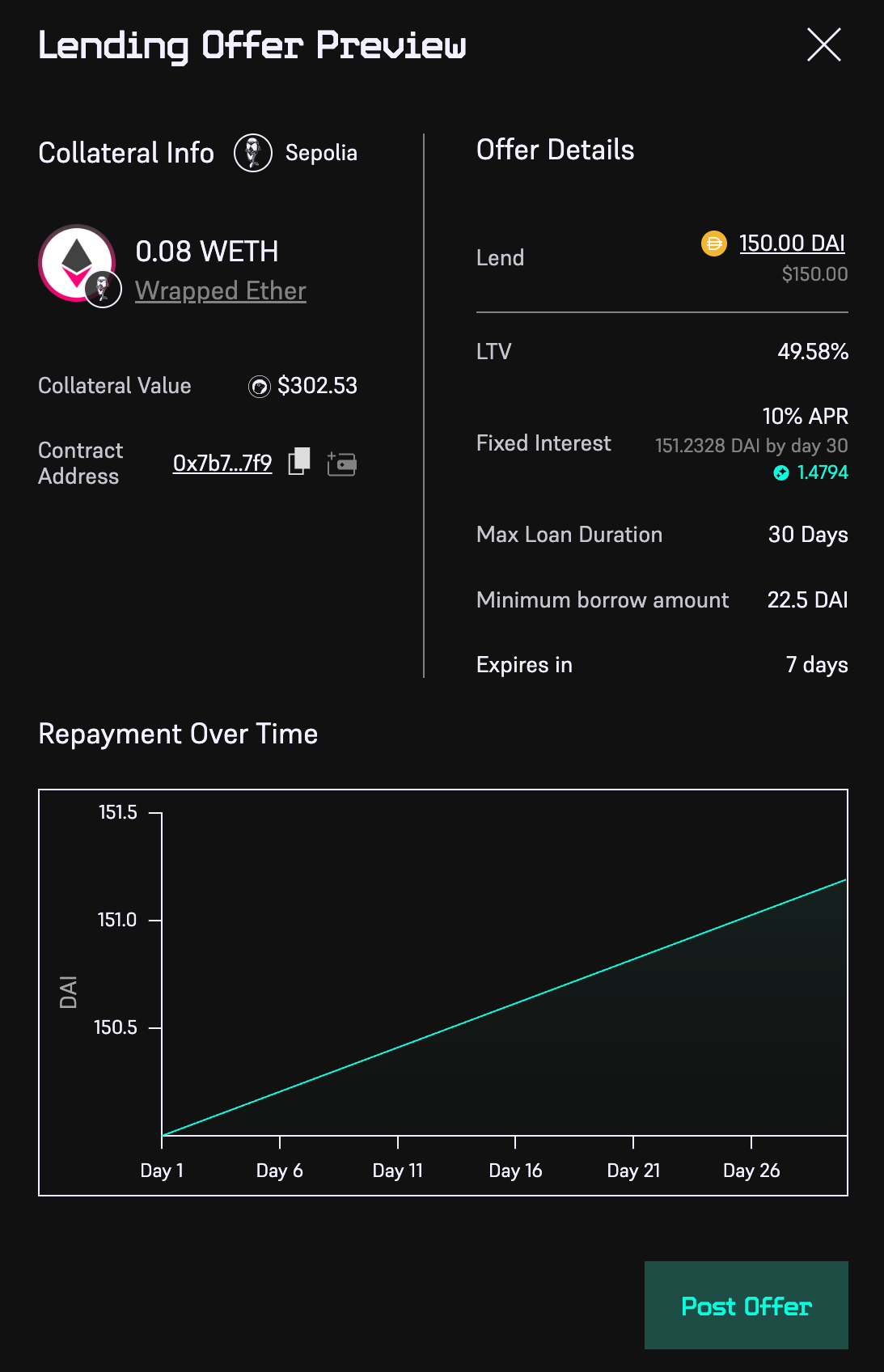Once your lending offer is submitted, it will appear in the "Borrow" section of the Market, where any borrower will be free to accept it or counter-propose.