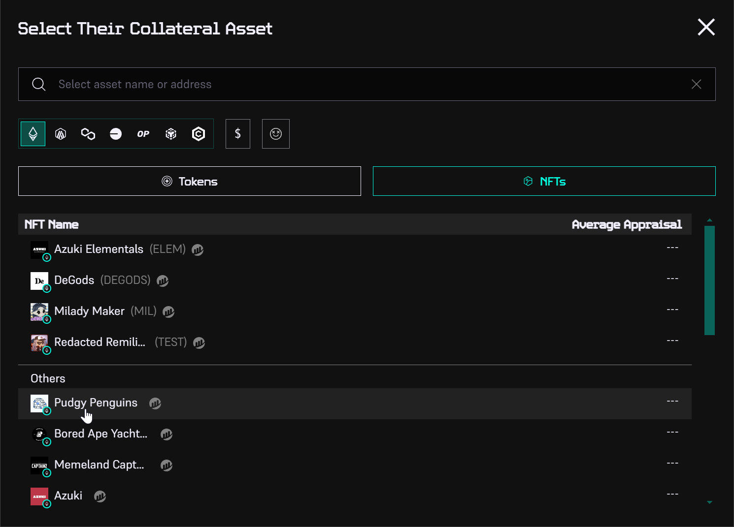 - Pick a collateral and amount (tokens or NFTs) for the borrower